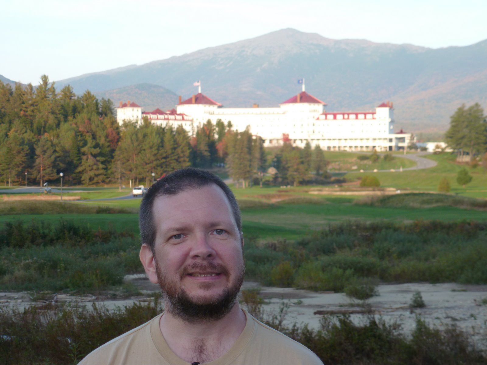 Here I am in a picture with the Mount Washington Hotel at Bretton Woods in the background. That was the place of the meeting which set up the International exchangability of money. We didn't stay at the Hotel this time around, nor did we ride the cog railway up to the top of Mount Washington, but who knows, someday, we might.